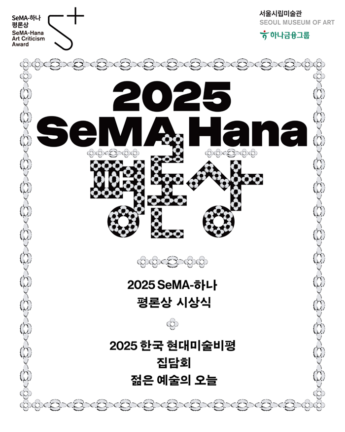 서울시립미술관은 하나금융그룹과 공동으로 SeMA-하나 평론상을 제정하여 2025년 제6회 수상자로 김윤진을 선정하고 시상식을 개최합니다. 아울러, 연계 행사로 <2025 한국 현대미술비평 집담회>를 열고 한국 현대미술의 현장과 비평 그리고 담론을 살펴보는 시간을 갖습니다.