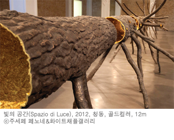 지난 45년간 자연과 인간의 관계를 탐구해온 이탈리안 작가 주세페 페노네는 런던 블룸버그 커미션을 위하여 내부가 밝은 금색으로 장식된 청동으로 주조한 나무조형물을 제작하였다. 길이 12m에 달하는 커다란 설치작품으로 갤러리 공간을 넓게 가로지른다. 1969년 주세페 페노네(1947-)는 단순히 얇은 왁스 레이어를 나무 위에 씌우는 방식으로 시작된 작품제작에 이어 이를 청동으로 주조하는 아이디어를 생각하였다. 40년이 흐른 지금 그의 오랜 계획을 실천하고자, 이번 블룸버그 커미션을 위해 왁스 결과물을 다시 청동으로 주조하여 독특한 결과물을 만들어내었다. 작품 <빛의 공간>을 얼핏 보면 실물 사이즈로 주조된 커다란 낙엽송으로 보일수도 있으나, 속을 들여다보면 나무속이 텅 비어있다. 청동으로 주조된 나무의 내부에는 조형물을 만드는 과정에서 생성된 많은 지문과 수작업의 흔적이 나무껍질에 섬세하게 남아있다. 또한, 나무 내부의 금빛은 마치 나무 안에 생명을 불어넣은 듯 환하게 빛을 발한다. 나무껍질과 손가락 지문의 결합은 떼어놓을 수 없는 자연과 인류의 결속력을 의미한다. 페노페는 예술작품의 창조에 감각과 도전정신을 요구하는, 급진적인 사고그룹이었던 ‘아트 포베라’ 그룹의 일원이었다. 이번 전시는 자연과 도시와의 관계를 모색하는 토크와 이벤트 프로그램을 진행하여 깊고 다양한 방법으로 전시내용을 공유하고자 한다.