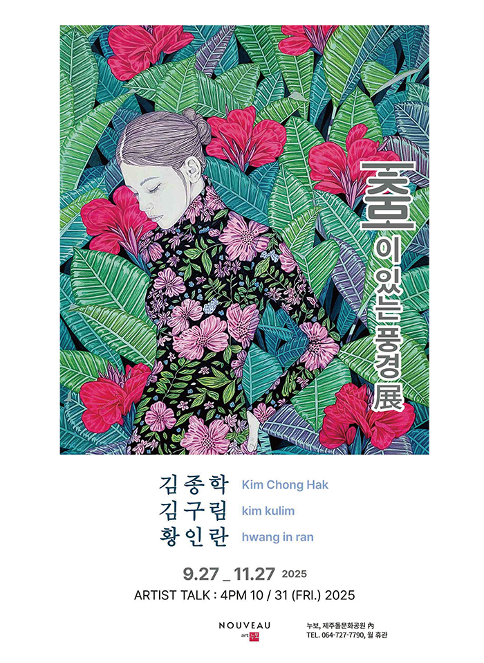 인간의 원초적 예술인 '춤'의 세계에 매료된 김종학, 김구림, 황인란 3인 기획전'이 제주돌문화공원 안에 자리잡은 갤러리 누보(대표 송정희)에서 열렸다. 제목은 '춤이 있는 풍경'으로, 오는 9월 27일 개막해 11월 27일까지 약 두 달간 진행된다.