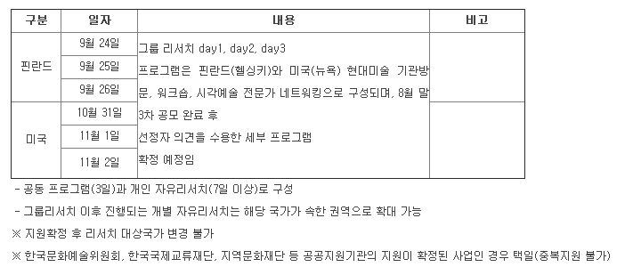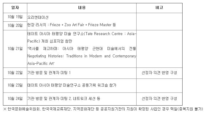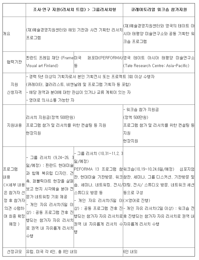 - 시각예술 경력급 기획인력의 프로젝트 구상 및 개발을 위한 작가 리서치, 국제적 동향파악, 네트워크 구축 등을 목적으로 하는 리서치 지원