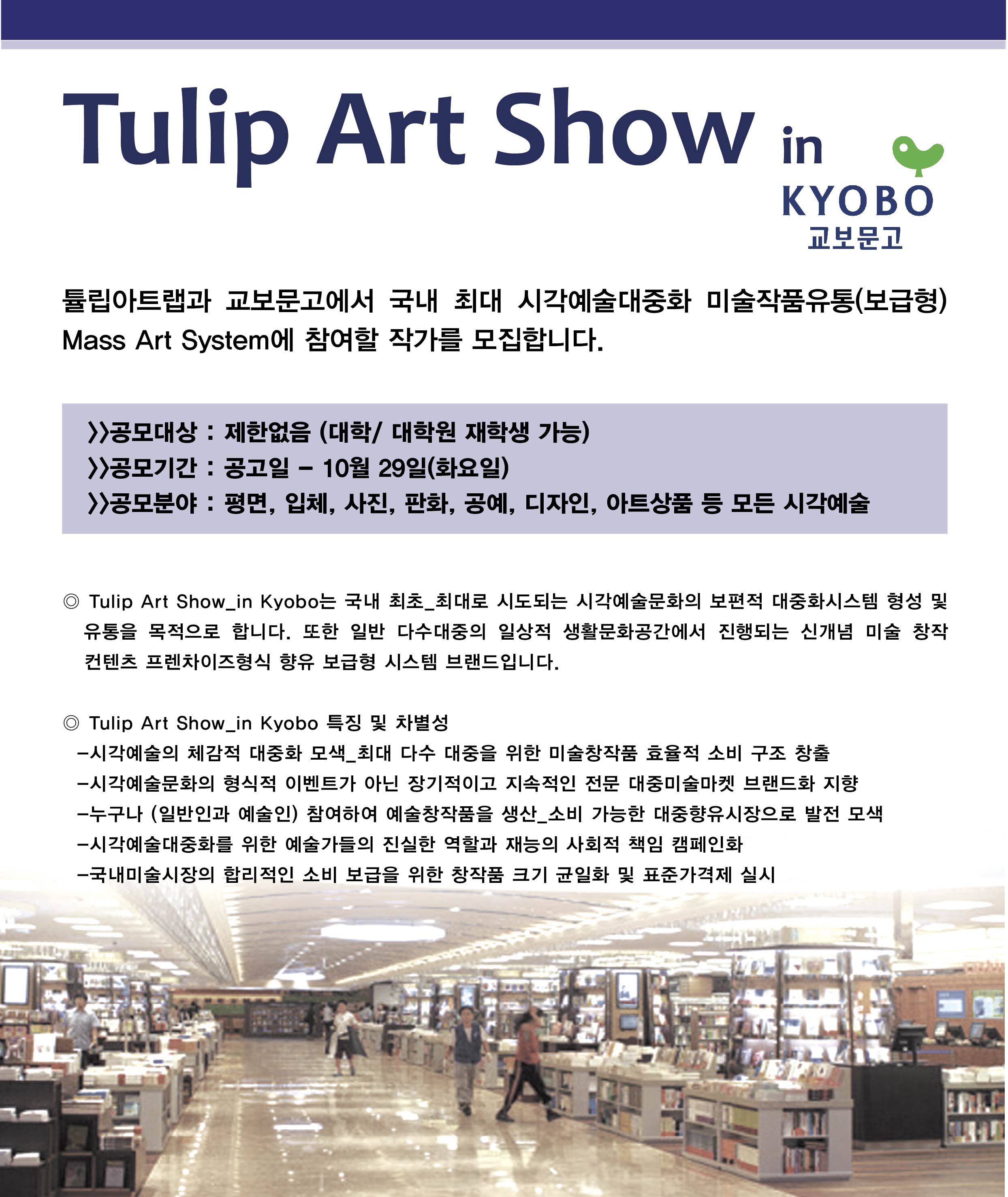 ◎ Tulip Art Show_in Kyobo는 국내 최초_최대로 시도되는 시각예술문화의 보편적 대중화시스템 형성 및 유통을 목적으로 합니다. 또한 일반 다수대중의 일상적 생활문화공간에서 진행되는 신개념 미술창작 컨텐츠 프렌차이즈형식 향유 보급형 시스템 브랜드입니다.