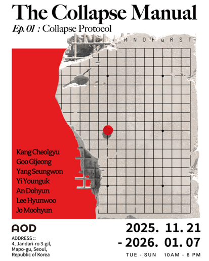 해당 전시는 오주현이 기획을 맡아 AOD 뮤지엄 공간에서 열리게 되며 1부 전시 The Collapse Manual_Collapse Protocol 는 강철규, 구기정, 양승원, 이영욱, 안도현, 이현우, 조무현 일곱 명의 작가가 참여한다.