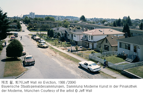 이번 전시에는 80년대 초부터 캐나다 출신 사진작가 제프 월의 사진을 수집하기시작한 뮌헨의 미술관과 개인 소장가들의 소장품 19점을 한자리에서 볼 수 있는 기회이다. 이번 전시에서 보여지고 있는 그의 초기 사진 작품들은 모두 광고 전광판과 같은 효과를 주는 라이트 박스가 도입된작품들이다. 그는 씨네마토그래피라는 영화적 촬영기법을 통해, 철저히계산된 구성을 통해 이미지를 연출하고 재생산한다. 이러한 과정을 통해 현대 도시에서 흔히 발견되는 사회적이고정치적인 문제를 가시화하거나, 미술사의 유명한 작품을 현대적으로 재해석하거나 인물화, 풍경화, 역사화, 정물화등 회화의 다양한장르를 사진이라는 매체를 통해 접근하고 있는 점이 인상적이다.