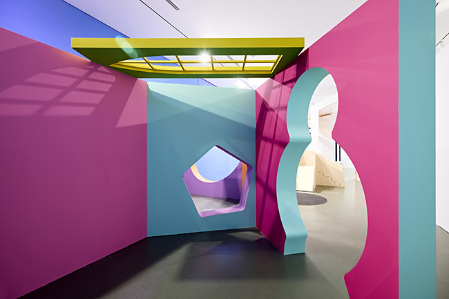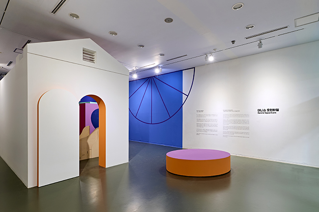 전시구성은 크게 1부과 2부로 나뉜다. 1부는 데니스 오펜하임의 <위장지> 속 조형요소들을 놀이공간처럼 자유롭게 펼쳐 놓았다. 2관의 주 관람객인 어린이를 대상으로 기획한 이 곳은 작가의 의도와 마찬가지로 우리가 흔히 볼 수 있는 문, 창문과 같은 건축요소들이 본래의 기능과 다르게 새롭게 연결되고 조합되어 있다. 어린이 관람객은 좁은 아치형의 문과 미끄럼틀을 지나 전시에 몰입하는 공간으로 자연스레 진입하게 된다. 신체의 움직임은 시선을 따라 다음 영역으로 이동하고 탐색하며, 정해진 동선 없이 자연스레 공간을 흘러다니며 ‘위장지’를 경험하도록 기획하였다.