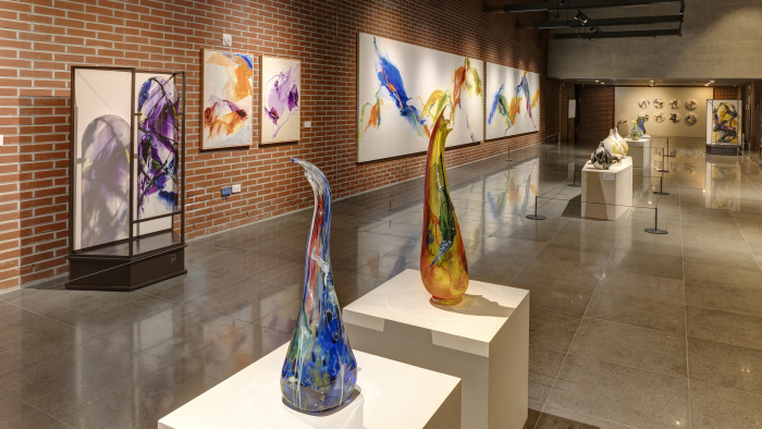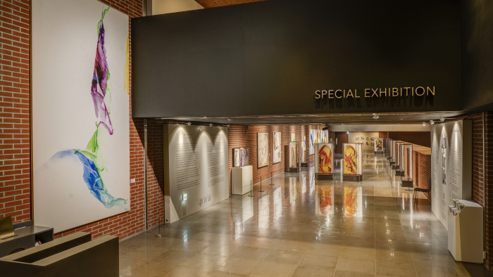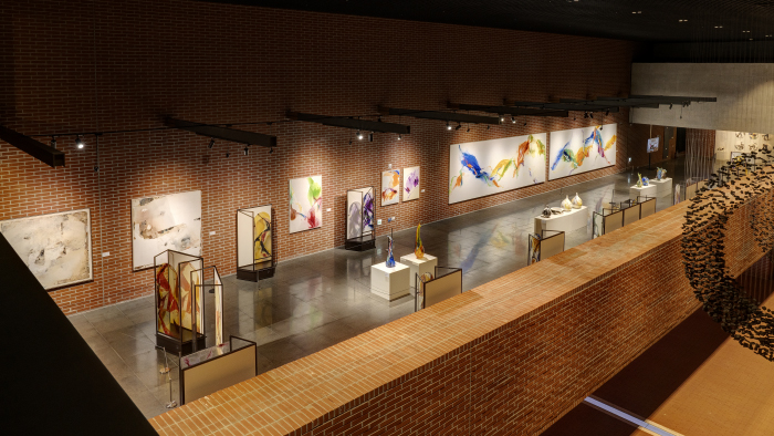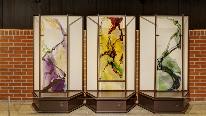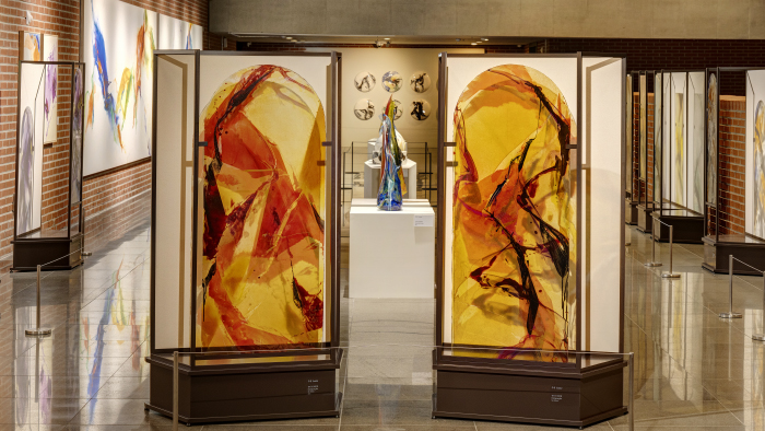 Breaking away from the traditional method of dividing the surface with lead, he developed a modern technique of painting directly onto large float glass. In his compositions, he maximizes the interplay between intense color and expansive empty space, creating harmony between Eastern notions of emptiness and Western use of color. His diluted oil paints, soaked into the surface of the canvas, recall the spirit of traditional East Asian ink painting. In this way, his works are born through the fusion of tradition and modernity, and through a continual dialogue between East and West-a process that is still evolving.