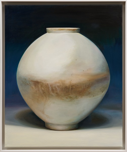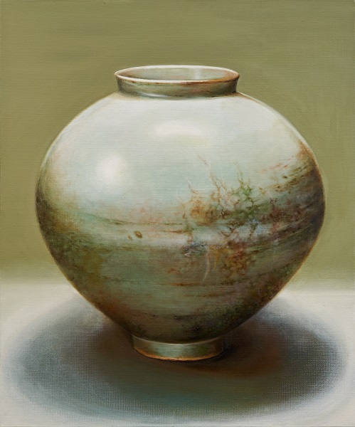 화면에 그려진 도자기의 본질은 형태의 완성보다 형성되는 과정에 있다. 색을 반죽하고 물성을 다듬으며 화면 위에서 층을 쌓는 일련의 과정은 단순한 묘사가 아니라 수행에 가깝다. 그 과정 속에는 작가의 호흡과 내면의 리듬이 서려 있다. 그가 그려낸 도자기의 표면에는 불의 흔적을 연상시키는 색의 변화와 미세한 균열이 남는다. 이들은 모두 예측할 수 없는 자연의 개입을 닮아 있으며 작가는 그 우연을 거부하지 않는다. 통제하지 않음으로써 얻어지는 질서가 있으며 작가는 그 질서를 받아들인다. 완성된 형태보다 그 안에 스며든 시간의 결이 중요하다. 화면의 균열은 세월의 주름처럼 느껴지고 덧칠된 색의 무게는 인생의 농도를 닮았다.