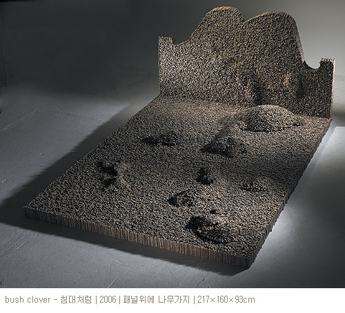 ‘나뭇가지 작업’에 대한 또 다른 관점으로서는, 나무라는 재료가 지닌 물성을 부각시키는 작업으로 이해하는 관점이 있을 수 있다. 사실 무수하게 쌓여 있는 싸리나뭇가지들의 단면들을 가까이서 응시하다 보면 잠시 그러한 ‘물성의 미학’에 몰입되어버리는 우리 자신을 발견할 수 있다.