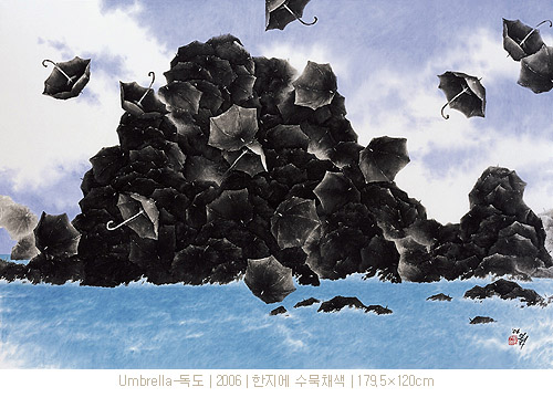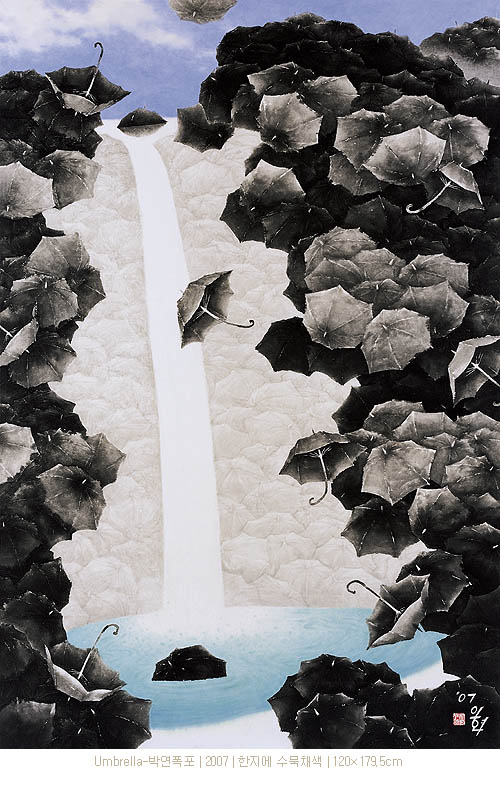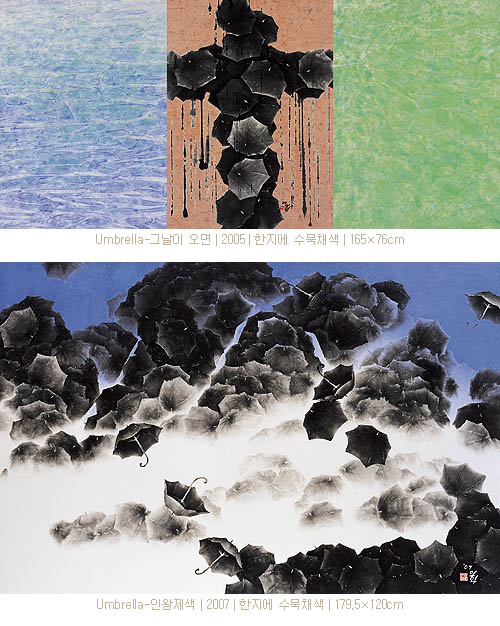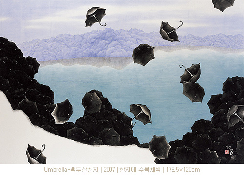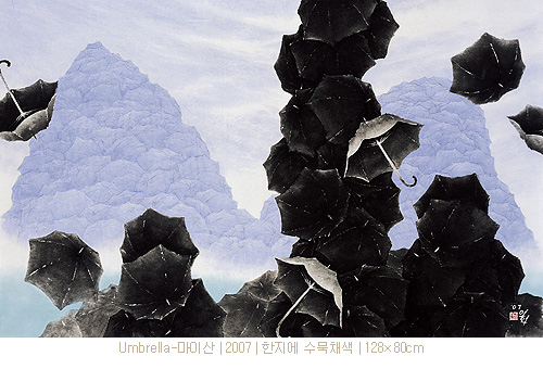 그의 우산은 이제 새로운 면모를 통하여 새로운 시대를 호흡하고자 한다. 사실 우산은 그 자체로 대단히 강한 상징성을 지니고 있는 것이다. 그것은 낭만과 우수의 상징일 뿐 아니라 해맑은 동심의 추억을 불러일으키는 것이다. 작가가 만약 이러한 우산의 일차적인 인상과 이미지만을 차용하였다면, 그것은 소재주의의 편협함에 함몰된 결과를 초래했을 것이다. 그러나 작가는 이를 통해 인간과 자연, 그리고 생명에 대한 사유와 긍정을 표출해 내었으며, 우산을 단순한 소재주의적 발상에서 벗어나 특정한 의미를 지닌 상징체계로 승화시킨 것이다. 이제 그의 우산들은 또 다른 대상과 소재를 아우르며 새로운 의미와 가치를 지닌 의미 있는 조형 부호로서 화면에 등장하고 있다. 백두산 천지, 독도, 인왕산, 모악산 등 상징성 강한 산수 풍광들을 우산을 통하여 재구성하여 조형화하고자 하는 근작들은 이전의 작업들과는 다른 또 다른 장쾌한 스케일의 심미를 보여주고 있다. 일정한 시의성을 바탕으로 상징성 강한 산수 풍광의 양태를 차용하지만, 이를 해체한 후 다시 우산이라는 특유의 형상 부호와 조형체계를 통하여 재조합함으로써 그것은 전혀 다른 의미를 지니게 된다. 주목되는 것은 [박연폭포], [인왕재색] 등을 재해석한 작품일 것이다. 이는 전통에 대한 보다 적극적인 재해석의 시도라는 점에서 대단히 흥미로운 것이며, 향후 작가의 작업 방향을 가늠해 볼 수 있는 유력한 단서라 여겨진다. 즉 이전의 우산들이 서정과 낭만을 전제로 한 상징적인 부호였다면, 이제 그의 새로운 우산들은 서정과 서사를 동시에 아우르는 보다 큰 의미의 상징체계로 구체화되고 있다 할 것이다.