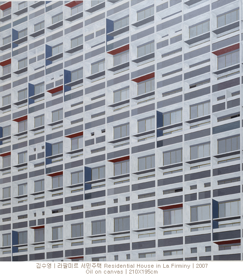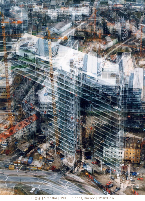 시각적인 혼란을 주는 작가들 중에서도 김수영과 이종명은 실제 장면에 대한 전통적 원근법에 약간의 터치를 가함으로써 혼란스러운 시각적인 착각을 유발한다. 눈의 위치에서부터 하나의 점이 될 때까지 인식되는 공간의 끝점을 소실점으로 잡고 눈의 연장선을 긋는 원근법을 잘 적용하면 꽤 근사한 공간감이 평면 속에 드러나게 됨에도 불구하고 이를 의도적으로 무시하고 자신의 눈에 읽히고 인식되는 대로만 우선하여 화면에 옮기는 작가가 김수영이다. 작가의 그림을 보면서 발견하게 되는 것은 각도를 일부러 삐뚤게 낸 캔버스에 그린 게 아닌가 하는 의심이다. 그러나 어김없이 각도는 정90도이고 고전 원근법과는 다른, 이론보다는 실제에 기초한 작가의 작업방식으로 인하여 틀 자체가 왜곡되어 보인다는 것을 알 수 있다. 즉, 우리가 배워왔던 관념적인 원근법을 적용하지 않고 실제 보이는 대로 건물의 선을 캔버스에 옮겨 담은 것이었다. 건물의 표면이 정형화된 창틀로 인해 규칙적인 패턴 형식으로 드러나는 이미지이면서 견고한 건물의 특성을 드러내는 방식으로서 원근법을 활용한 듯이 보인다. 그렇지만 그녀가 화면 속에 담은 것은 소실점을 두고 기계적으로 맞추어진 원근법과는 확실히 다르다. 그래서 화면을 바라보다 보면 자꾸 건물이라는 관념의 구조와는 다른 혼돈을 느끼게 된다. 건물의 수직이 틀린 것 같고, 수평이 뒤죽박죽인 것 같기도 하고 심지어 캔버스도 비뚤어져 보인다. 그렇다고 시각적 인식의 질서를 흩트려 놓지도 않는다. 그냥 자신의 눈에 비치는 그대로를 따라서 그려보는 것이 작품의 출발이기 때문이다. 우리의 눈은 이 얼마나 비정형적인가. 사진작가 이종명은 한술 더 떠서 찍힌 시선의 이미지를 화면 위에서 변하게 만든다. 실제로 관객은 건물이 움직이고 휘는 듯한 착각을 하게 된다. 그의 사진 속 건축물은 도시의 가장 높은 어떤 곳에서 찍었다는 것을 알 수 있도록 주변의 도시 이미지가 함께 담겨있다. 같은 대상을 찍은 필름을 겹쳐서 이를 그대로 프린트 하여 결과적으로 중첩된 이미지를 보여준다. 딱딱한 도시의 건물은 이러한 과정에 의해 갑자기 유연한 유기체처럼 변한다. 우리는 관람자의 관점이 순간적으로 변한듯한 착각을 하게 되며 그것이 교묘한 조작으로 관객에게 보여지는 이미지는 허구적이고, 작가가 지배하는 또 다른 풍경으로 제시된다. 그의 시선이 최대한 높은 곳에 두어져 있다는 것도 이러한 점을 시사한다. 아마도 그리고 그 도시에서 가장 거대하고 견고한 건물을 사진을 통해 자신만의 이미지로 재 조합하여 창조해 낸다는 것은 전지전능에 가까운 권위를 만끽할 수 있는 작가만의 방식이 아니었을까. 이로 인해 작가는 초현실의 이미지를 만들어냈고 우리의 눈을 통하여 건물뿐 아니라 현세의 레이어를 신비롭게 바라볼 수 있는 방법을 보여주고 있는 것이다.