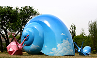 이규민의 달팽이 조각은 세련되고 유기적 형태에 매끄러운 질감과 아름다운 색채로 표현하여 매우 귀여운 느낌이다. 출품작은 파란 하늘과 구름이 그려진 거대한 달팽이 집, 지구를 뚫고 솟아오르는 달팽이, 엄마와 아기 달팽이, 부부 달팽이, 연인 달팽이 등. 얼핏 보기에도 정답고 산뜻한 컬러인 핑크, 노랑, 파랑 달팽이 조각들이 높이・길이 2~3.5m의 대작을 포함하여 총 18여 점 출품된다. 아마도 대형 달팽이는 한국에서 가장 큰 달팽이가 아닌가 싶다. 작품 재료는 F・R・P(일종의 강화 플라스틱)이며, 작품의 컬러는 아크릴 물감과 우레탄 도료를 사용했다.