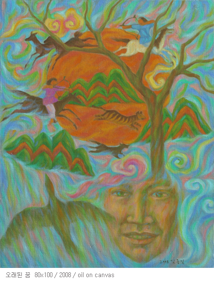그녀가 고구려벽화를 발견한 것은 그 드림타임의 시간으로 푹 빠져 들어간 뒤이다. 그곳에서 그녀는 춤추는 산이며, 까마귀들이 앉아있는 신단수, 해님과 달님, 삼족오, 소머리를 한 신농씨 등을 만났다. 그리고 새로운 힐링의 힘을 발견한다. 그렇게 그녀가 지향하는 신화적 공간은 우리 조상들의 숨결과 맞닿아있다.