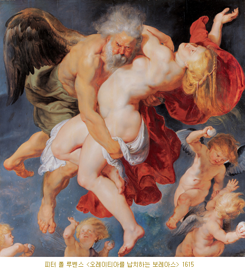 「오레이티아를 납치하는 보레아스」는 신화주제를 다룬 대형작품으로 루벤스가 제자들의 손을 빌리지 않고 손수 제작한 것으로, 비엔나아카데미뮤지엄을 대표하는 수작이다. 고대문헌과 예술의 정통했고, 인문주의자였던 루벤스는 그림의 주제를 그리스신화에서 찾았다. 오레이티아를 납치한보레아스는 루벤스 이전에 어떤 화가도 다루지 않았던 주제였기 때문에 그 형상화에 있어서도 도상전통이 존재하지 않았다.