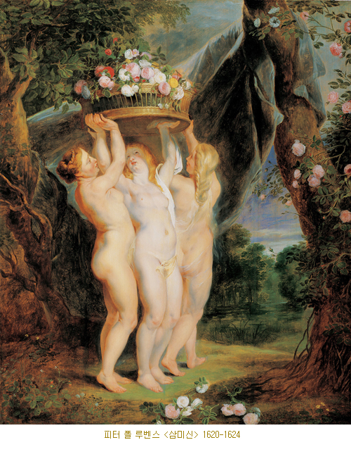 「삼미신」은 라파엘도 그렸던 주제이다. 그리스신화의 제우스와 에우리노메의 딸들로 광휘, 쾌활, 꽃을 상징한다. 아름다운 누드화로서, 이들이  서로 사랑스럽게 포옹함으로써 주고 받고 답례하는 자비의 순환과정을 의인화한 작품으로 그만의 해석이 돋보이는 작품이다. 루벤스는 7차례나 삼미신을 그렸는데, 이 작품은 내용이나 형식에서 새로운 시다고 엿보이는 작품이다.