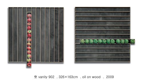 그의 최근 작업은 이처럼 기존의 생활기물이 가지고 있던 실제적인 공간을 개념화시켜 현대적인 조형공간으로 탈바꿈시킨다. 생활기물을 직접 가져다 쓰던 이전과 달리 화실에서 직접 화판을 만든다. 상자의 개념을 응용하여 기하학적이고 입체적인 조형물을 만들고 그 위에 사과를 그려 넣는 식이다. 주어진 조건을 수용하는 데 그치지 않고 직접 의도적인 조형의지를 드러내는 것이다. 여기에서 그는 사과의 이미지가 들어있는 부분과 들어있지 않은 부분을 양립시키는 형태, 즉 음양의 원리를 적용한다. 이는 세상의 모든 이치가 음양의 원리로 설명될 수 있다는 사실을 상기시키기 위한 의식적인 방법이다.
