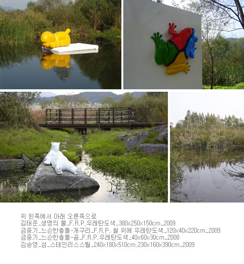 관내 및 초대작가로 구성된 11명(팀)은 각기 생태학적인 해석과 연구 작업을 통하여 약 30여점의 야외 조형물로 학습장 내 습지와 연못, 강, 조망대 등 풍광과 시설을 적극 활용한 친환경적인 예술공간 조성을 이루어갈 것입니다. 특히 기존 전시장소를 관내 야외 특정 공간인 생태공원에 집중, 전시하고 전시기간 종료 후 참여 작품을 영구설치 함으로서 지속성을 띤 생태/환경특정적인(eco-specific) 공공미술프로젝트를 선보입니다.