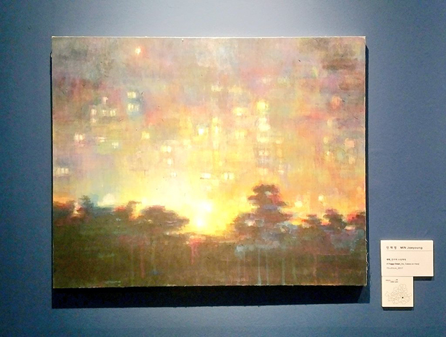민재영 작가의 새벽을 포함한 세 점의 작품이 벽에 연달아 전시되어있었는데 폰카메라에는 미처 다 담기지 않는 아스라하고 다채로운 색감이 모두 예뻤다. 새벽 안개 속으로 번지는 도시의 빛들.