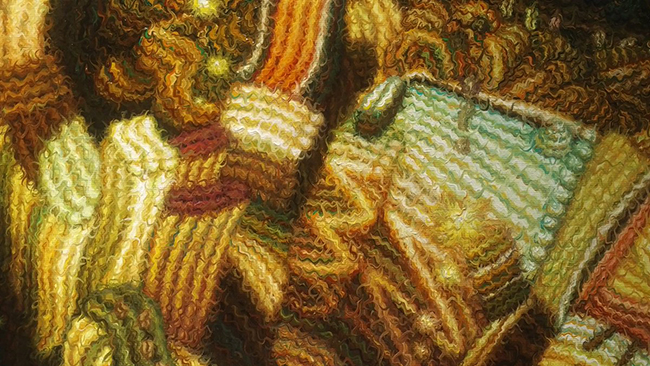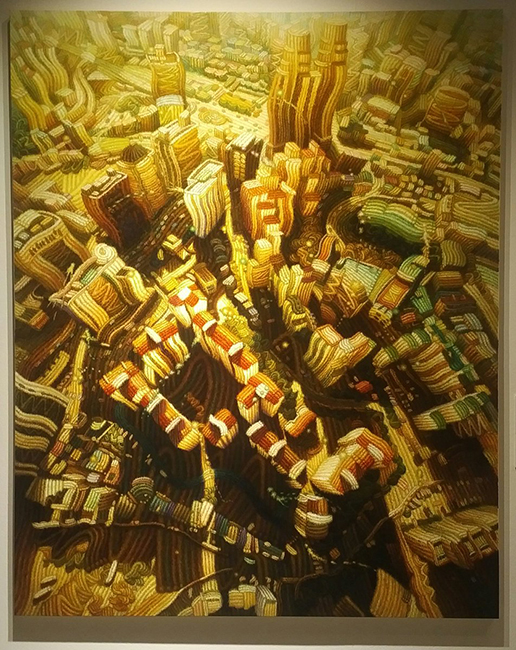 함명수 작가의 도시풍경은 마치 털실로 짠게 아닐까 싶은 보송보송함이 느껴진다. 전체샷에선 잘 안느껴지지만 세부샷에서는 털실같은 표현이 잘 보이는데 털실로 짠 도시 처럼 보인다. 야경을 담은 다른 한 점도 같은 느낌이다.