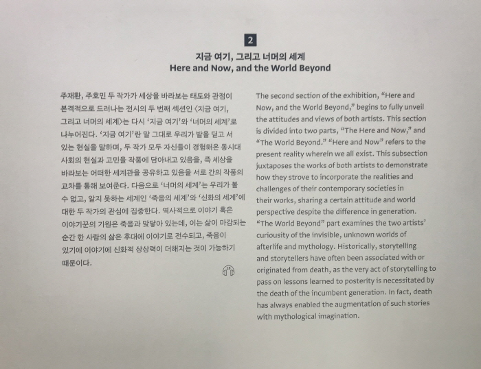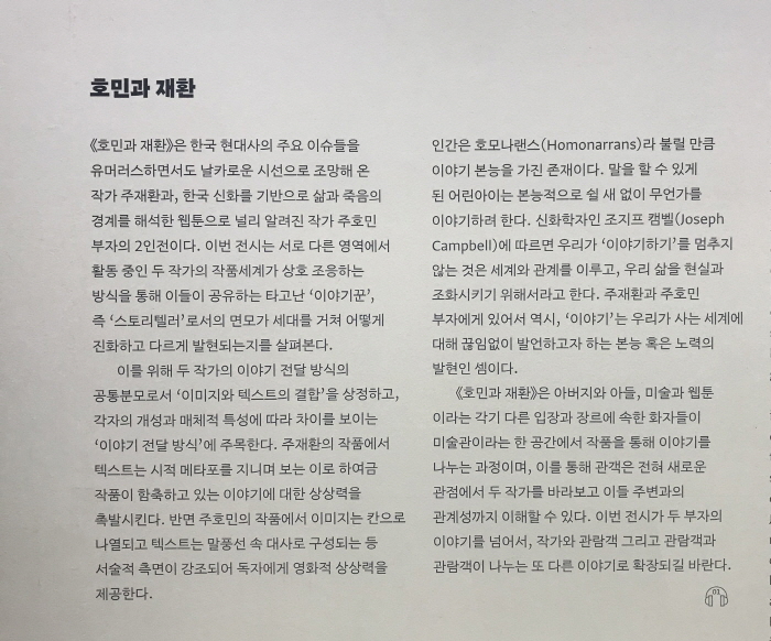 한국미술계의 대표적인 원로작가 주재환(1940-)과 한국의 1.5세대 웹툰 작가로 2010년 웹툰 『신과 함께』로 대중에게 알려진 주호민(1981-) 부자의 2인전 《호민과 재환》전이 5월 18일부터 서울시립미술관 서소문관에서 개최 중이다. 한국현대사의 주요 이슈들을 유머러스하면서도 날카로운 풍자로 작품활동을 해온 주재환의 작품세계와 한국 신화를 바탕으로 삶과 죽음의 경계를 해석하고 이야기한 웹툰작가 주호민의 작품세계를 보여준다.