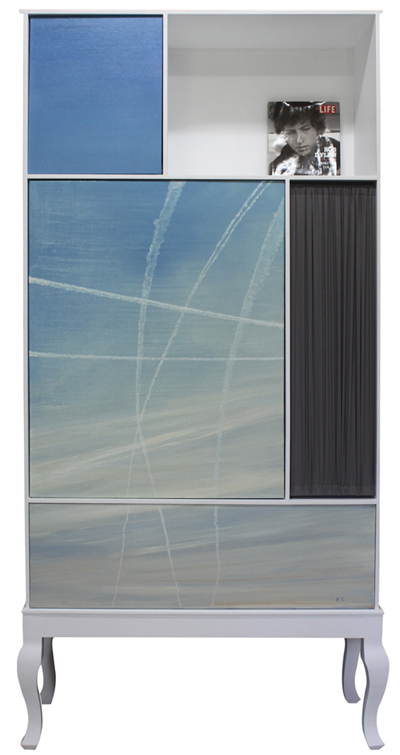 이것이 다층적이고 입체화된 회화적 공간에 오브제를 차용하여 복합적인 조형형식을 구축했다면, 또 다른 'untitled'는 거의 가구형태를 취하고 있다. 가구는 우리의 일상적인 삶과 관련된 고유한 용도를 가진 생활용구로서 미술품으로서는 다소 낮설어 보인다. 하지만 이 작품에서는 가구의 형태가 어엿하게 회화의 공간을 형성하고 있다. 그림이그려진 서랍장을 열면 앞에서 창문처럼 또 다른 작품이 있을 것 같고, 한 쪽 칸에 설치된 커튼을 살짝열어보고 싶은 충동을 느끼게 한다. 또한 맨 위 빈 공간에 놓여진 밥 딜런의 전문책자는 한편 궁금증을유발케 하면서도 묘한 미적 향유를 선사해주고 있다. 회화이면서 조각 같고, 조각이면서 가구 같은 작품으로 인해 다양한 미적 경험을하게 하는 것, 이것만으로도 이 작품의 독특한 미적 특징이 보여진다.그렇지만 한 켠에서는 밥 딜런이 놓여진 까닭은 무엇일까?.... 그 미묘한 회화적 빈 공간에작가는 어떤 특별한 의도로 밥 딜런을 선택했을까?. 그는 멋쩍은 표정으로 '밥 딜런이 활동하는 곳이 주로 캘리포니아이고 그림도 캘리포니아 하늘이 떠올라서 그린 것이고 해서 이들을매치시켰다' 라고 말한다. 작가는 유독 캘리포니아만 여러 차례 자주 방문했다. 작가로서는 유럽이나 다른 지역도 가고 싶겠지만 그는 조금이라도 여건이되면 무조건 캘리포니아로 떠난다. 그곳에서의 여정은 이제 적당히 익숙해졌고 특히 세계에서 가장 큰 로즈볼 프리마켓(Rose ball Fleamarket)을 즐겨 찾는다. 그곳에서 작업의 재료가 되는 온갖 잡동사니를 구하는 것이 중요한 이유이다. 온갖오브제와의 대면과 선택, 그 자체가 작업의 시작인 것이다. 작가의설명을 들으니 밥 딜런의 이미지가 낯설지 않게 다가온다. 작업실에 가득한 오브제를 다시 보니 작가가먼 여정에서 고른 물건이라 예사롭지 않게 보인다. 그리고 주변에는 한자가 더러 적혀 있다. 잡화(雜畵)라는 단어가 적힌 푯말을 들고 있는 작은 인형, 해골, 마리오네트 등등.  혼합매체 'untitled' 시리즈작품에 특히 작가가 수집한 오브제들이 작품의 내용에 따라 적절하게 배치된다. 오브제 자체만으로도 흥미를끌고 궁금증을 유발할 수 있고, 자화상은 초기에는 회화적 방식으로 표현했다면 이제는 자소상과 오브제를혼용하여 블랙유머의 내러티브를 표출하면서 자신을 드러내고 있다. 작품에는 한자가 종종 적혀 있다. 그 중 <해의반박(解衣般)> 그림은 옷을 풀어 헤치고 다리를 쭉펴고임해라라는 뜻이다. 제자들에게 해골을 제시하고 제 멋대로그려보라고 말하는듯한 작가의 모습이 해학적이다. 작가가 한자를 자주 작업에 사용하는것은 유년시절에 한학자이며서예가이신 아버지의 영향이 크다고 한다.