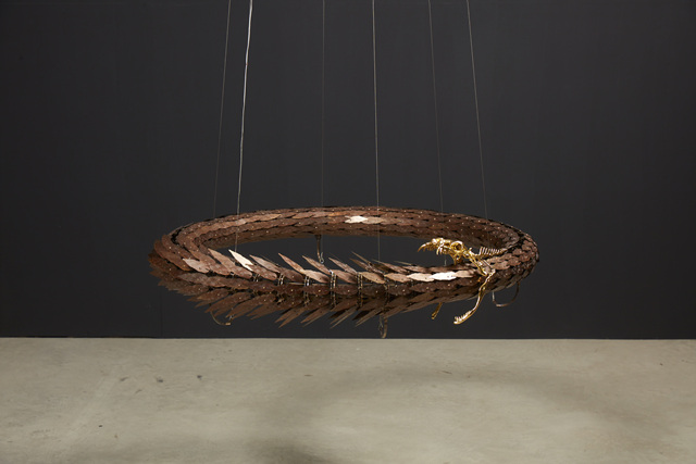 과학과 종교의 관련에 대한 논쟁적인 책 [눈 먼 시계공](리처드 도킨스)을 본 딴다면, 이 둘의 결합은 도닦는 시계공 같은 모습일까? 작품 [Ouroboros]는 동서양을 막론하고 등장하는 꼬리를 무는 뱀이라는 테마가 흐른다. 끝없이 제 꼬리를 물고 나아가며 원운동을 하는 뱀의 거대한 아가리가 있는 머리는 황금색이다. 그것은 끝없는 욕망이라는 주제를 전한다. 역사의 순환을 추동하는 것은 욕망이다. 꼬리가 꼬리를 무는 형상은 무한하므로 욕망도 무한하다. 공(空)처럼 욕망의 실체는 없다. 근대의 과학기술이야 말로 그러한 순환적 사고를 원시적 사고로 간주하며 선적 진보를 추동해 왔지만, 그 또한 ‘스스로를 먹고 스스로를 소비하는 것을 반복하는 문명’의 굴레를 벗어나지 못했다. 이들 작품에서 움직이는 형태는 서사의 뼈대를 가시화한 것이다. 자연에 토대를 둔 신화는 포괄적이고 보편적이다. 한편 회전하는 또는 둥근 형태가 역사적인 형식과 결합하면서 보다 구체적으로 문명에 대해 말하는 작품들이 [Pavilion](2012), [Merry-go-round](2012), [URC](2014, 2016)이다.