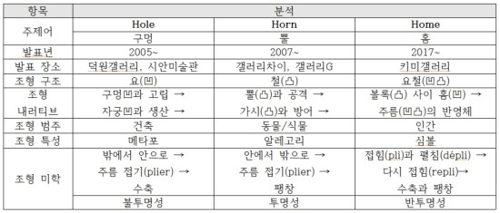 그런 차원에서 올해의 개인전은 이전의 두 시리즈 작품들의 맥을 잇는다. 그 하나는 '구멍(Hole)' 시리즈로, 건축적 조형으로 거대 덩치의 콘크리트나 FRP로 탐구했던 ‘불투명한 요(凹)’의 세계이다. 또 하나는 동물의 공격성(뿔)과 식물(가시)의 방어 개념이 뒤섞인 ‘뿔(Horn)’ 시리즈로, 반영체의 스테인리스 스틸로 탐구했던 ‘투명한 볼록(凸)’의 세계라 할 것이다. 올해 김지훈의 개인전은 이 두 시리즈를 각각 탈주하면서도 그 맥을 잇는다. 이번 전시의 주제 의식은 아래처럼 이전의 두 시리즈의 세계가 한데 어우러진 ‘반(半)투명’과 ‘요철(凹凸)’의 세계로 잠입한다.