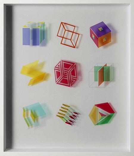 또 다른 작품은 ‘깊이의 단서로서의 색’의 차원을 극명하게 보여준다. 33 x 23cm의 플렉시글라스 판에 한 개씩의 입방체 이미지를 그려 넣은 5개의 개별 작품이 모여 ‘하나의 시리즈 작품’처럼 구성된 이것은 〈통제된 우연, 사각형의 변주201705(Controlled Coincidence, Variation of cube2017May)〉이라는 제목을 지니고 있다. 이 작품에는 ‘빨간색이나 파란색의 선이 아닌 두꺼운 흰색선’을 인그레이빙(Laser engraving) 기법으로 새겨 넣고 그 두꺼운 선들의 꼭짓점을 연결하는 사각의 색 면을 입방체 안에서 마치 마술처럼 선보인다. 앞서 언급했던 작품에서 선보였던 ‘보이지 않는 사각의 면’이, 이 작품에서 비로소 ‘보이는 사각의 색 면’으로 구체화된 셈이라 하겠다.