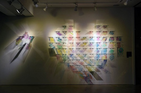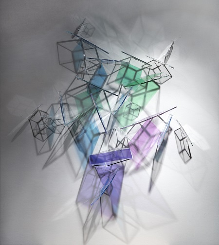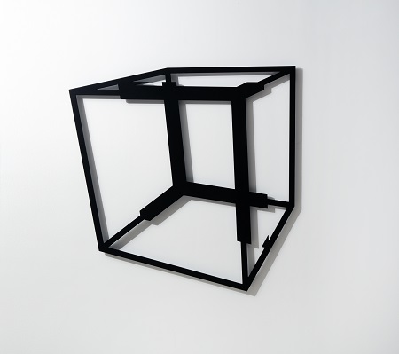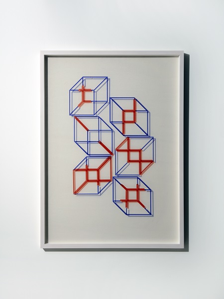 보라! 또 한 작품은 앞서 플렉시글라스 위에 올라선 빨간 입방체와 파란 입방체가 만드는 ‘선과 색의 통합’을 극대화한다. 앞판에 새겨진 파란색의 불완전한 입방체와 뒤판에 새겨진 빨간색의 불완전한 입방체가 겹쳐져 ‘하나의 완전한 입방체’를 만드는 방식으로 무수한 입방체를 만들어내기 때문이다. 이 작품에서도 빨간색은 파란색의 선보다 두꺼운 굵기(이거나 넒은 면)로 표현되고 있는 점을 주목할 필요가 있겠다. 이 ‘두꺼운 붉은 선’은 하나의 입방체 안에서 선의 꼭짓점들을 연결하여 ‘보이지 않는 사각의 면’을 형성하는 단서가 된다.