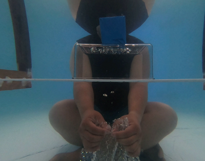 작품 〈심심 모으기〉는 전시장 가운데 설치된 커다란 크기의 푸른 수조 안에 들어가 우리가 흔히 ‘뽁뽁이’라고 부르는 포장용 에어캡을 하나씩 터뜨려 그 안에 들어 있는 공기를 하나둘씩 투명 용기 안에 모으는 작업이다. 어떤 경우는 물속에 몸을 담그고 얼굴만 수면 밖에 두고 앉은 채로 무심한 동작으로 에어캡을 하나씩 터뜨리기도 하지만, 또 다른 경우는 수중에 엎드린 채 스노클(snorkel)로 호흡을 하는 고된 자세로 에어캡을 마치 노동을 하듯이 터뜨리기도 한다. 작가 김등용은 무료함을 달래는 이러한 ‘심심풀이 혹은 심심파적’을 통해서 ‘공기 채집 놀이’라는 단순한 유희적 행위뿐 아니라 ‘공기 채집 노동’이라는 고된 행위를 동시에 실행한다.