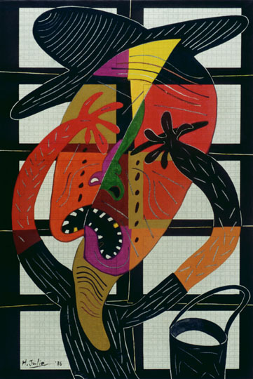 1980년대 중반에 들어서면서 황주리는 사실적 재현이 아닌 단순화하고 일그러진 인물들로 화면 전체를 채우기 시작했다. <가면무도회>(1982-) 시리즈 작품에서와 같이, 익명적 군상들은 “메마를 대로 메마르고 황폐해진 이 시대에 고독한 개인으로 살아가는 모든 사람들” 1) 의 모습이었다. 그는 바둑판이나 세포막을 연상시키는 구획된 틀 속에 이들의 초상을 담았다. 이는 마치 권역을 분할하여 과도한 산업화 과정을 추동해 온 한국 사회의 특수성 속에서, 자유로운 개인의 삶이 실종된 현실을 은유한 듯 보인다. 황주리에게 비친 당대 미술계 또한 이러한 사회 현상이 반영되고 있었다. 당시 한국 미술계는 1970년대 등장한 단색조 회화의 약진 속에서 이른바 추상과 구상의 양강 구도 체제로 넘어가고 있었다. 다양한 인물과 사물들이 혼재하는 황주리의 그림은 일상사의 모습들을 통해 형식주의 미학에서 배제해 온 일상을 복권시켰다. 또한 인간의 실존적 고통을 구현한 작업 과정은 사회변혁을 꾀하고자 한 민중미술과도 다른 노선이었다.