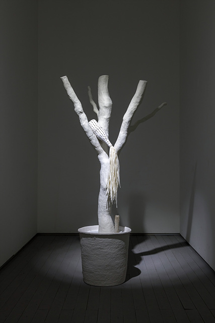 현대의 상품은 물신 숭배의 대상이 되어야 비슷비슷한 기능을 초월해서 큰 이득을 남길 수 있다. 이 작은 형태들을 큰 화분 형태를 배경으로 쏟아질 듯 배치된 하얀 병에도 구멍이 숭숭 뚫려 있다. [기우제]라는 제목은 물이 쏟아지는 기물의 형태를 활용한다. 그것은 유사함을 기준으로 서로를 연관 짓는 원시적 사고를 화분이나 일회용기 등 현대적 사물의 조합을 통해 표현한다. 마을 입구의 큰 나무에 둘러쳐진 주술적 장치 대신에, 작가는 자연의 축소모델인 화분을 세팅한다. 작가는 최신 사물을 오래된 방식으로 만든다. 여성의 노동이자 예술인 뜨개질의 방식도 혼용된다. 작가는 요즘 작업에 활용하는 짧은 뜨기 기법이 도자의 코일링 기법과 유사하다고 본다. 한편 흙으로 빚을 때 나는 자신의 손자국을 다시 짓눌러 삭제하기도 하는데, 그것은 부재를 통해서 존재를 확인하는 삶의 역설을 표현한다. 예술 또한 그렇다. 작가는 도예 작업이든 뜨개질이든 자신의 작업이 현대의 주요한 상품 유통의 회로에서는 벗어난 그림자 노동이라는 점을 깨닫는다.