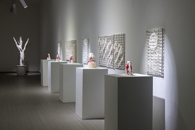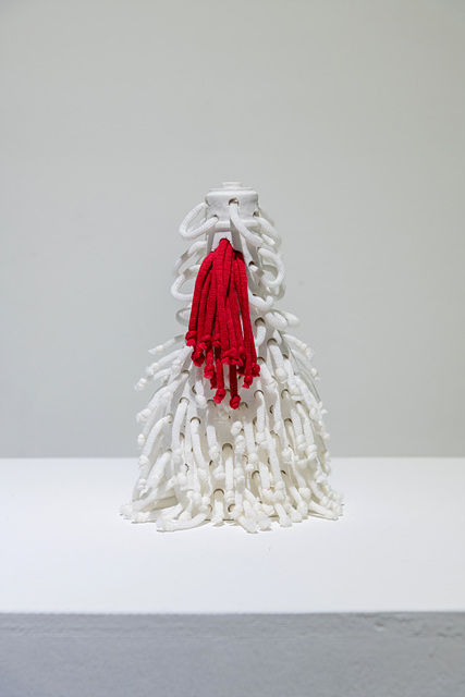 출시된 상품이 자기를 구입해 달라고 요란하게 떠든다면, 정체불명의 이 하얀 용기들은 침묵한다. 또는 무의미한 소음이긴 하지만, 아무도 신경 쓰지 않는 백색소음이다. 몸통에 뚫린 구멍은 무엇인가 사용되었다는 표시인 펀칭을 떠올린다. 용기 자체가 몸과 비유된다면 그것은 외부로부터 보호되는 튼튼한 경계를 허물어버린 취약한 상태다. 동시에 이러한 상태는 살아있는 것의 특징인 안팎의 소통을 암시한다. 섬유를 이용하여 구멍 밖으로 흘러넘치는 듯한 액체를 암시한 것은 여러 겹의 의미를 내포한다. 생명은 닫혀있으면서도 열려 있어야 생존할 수 있다. 닫혀있다가 열리는 상태는 인류학이나 종교학에서 오염, 죽음, 열락, 확장, 금기 위반 등등으로 관념화되곤 한다. 굿같이 다른 차원과 접속하려는 행위의 절정에서 이처럼 존재의 경계를 넘어오는 것들은 극적 효과를 자아낸다. 문혜주의 작업은 경계를 넘나드는 근본적 체험을 도예나 현대적 사물(상품)로 표현한다.