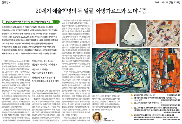 아방가르드와 모더니즘은 20세기 예술혁명의 두 얼굴이다. 러시아인 말레비치와 칸딘스키가 주도했던 혁명들이었다. 이 두 예술 운동 사이의 동질성과 이질성, 그리고 그 속성들 사이에 흐르는 지속과 단절의 역설적 메커니즘을 이해하는 것, 이것이 20세기와 그 이후의 예술세계를 이해하는 열쇠라 여겨진다.