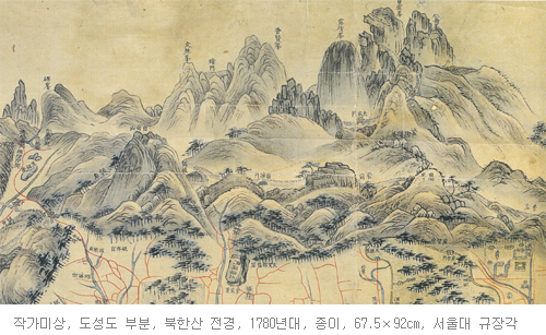 누가 그렸는지 모르지만 이중환이 택리지를 쓰던 1751년도 한참 지난 1780년대에 제작한 <도성도>의 부분인 <북한산> 모습은 황홀하리만치 눈부시다. 오른쪽 백운봉을 정점으로 인수봉과 노적봉이 우람하게 모여 삼각산의 형세를 이루고 서쪽으로 보현봉, 문수봉에 비봉까지 흐르는 원경(遠境) 아래로 시가지와 경계를 이루는 나무들의 행렬이 활력을 불러일으킨다. 그 이상한 기운 탓에 그림으로 나타내기 어렵다고 한 이중환의 말을 비웃기라도 하듯, 굴곡진 산악의 우람함을 화려한 필치로 묘사하는데 성공한 이 화가는 대체 누구일까. 연구자 가운데 정선(鄭敾, 1676-1759)의 후예가 그렸을 것이라고 짐작하곤 하는데 구도나 붓놀림의 섬세함만 보더라도 이 그림은 정조의 총애를 받던 김홍도(金弘道, 1745-1806 이후)나 그 동료의 것이라고 생각해야 할 것이다. 하지만 누구의 것이면 어떠하랴. 북한산이 이렇게 아름다운 줄 알려주면 그만이라, 화가는 그렇게 여겼을 터인데.