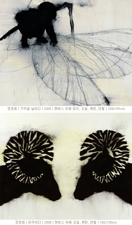 정경희의 작품제목이나 전시제목에는 기억이라는 단어가 많이 들어간다. ‘자유연상’(1회 개인전, 2003년), ‘기억을 날리다’(2회, 2005년), ‘기억 너머’(3회, 2007년) 등. 그러나 유동적인 검은 형상들과 날개는 기억에의 고착이 아닌, 기억의 가변성을 예시한다. 잠자리 날개가 한번 펄럭일 때마다 기억을 이루는 연결고리들은 헐거워지면서 재배치된다. 요즘 작품에서 검은색들 사이에 약간씩 보이는 금색은 기억의 하이라이트를 이루는데, 기억의 그물망이 새롭게 출렁일 때마다 그 결절 점은 변화한다. 오일 스틱은 자유 연상이나 끝없이 이어지는 사고의 선을 표현하기에 적당한 매체이다. 안료를 기저 면에 두텁게 쌓아올리는 서양화의 전형적인 방식이 아니라, 시작부터 마무리까지의 전 과정을 알몸으로 드러내야하는 드로잉은 먹을 떠올리게 하는 색감과 더불어 동양화의 느낌을 주는 요소이다.