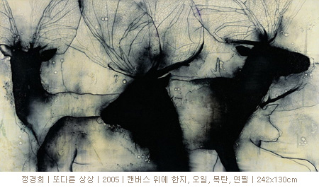 거울의 반영상과 그림자의 반사상은 구별된다. [그림자의 짧은 역사]의 저자는 거울이 자아라는 동일자를 확인하는 재현적 상황을 의미한다면, 그림자는 타자를 확인하는 것과 관계된다고 지적한다. 이미지/그림자는 자신에 대한 것이 아니라 타자에 대한 유사성이며, 미메시스가 아니라 닮아 보이는 것 만들기 혹은 시뮬라크라이다. 그림자 형상을 기본으로 하는 정경희의 작품은 거울 속에서 비춰지는 통일적인 형태가 부재하다. 그것은 명료한 형태가 드러나는 순간에도 위장한다. 최근 작품에 자주 등장하는 얼룩말 패턴은 이전에 잠자리 날개나 나뭇가지 등이 뻗어있던 초식동물의 뿔을 대신 차지한다. 자기 보호를 위해 주변 환경을 흉내 내는 의태mimicry라는 형식이 의미하는 바는 무엇인가. 그것은 부정적인 의미든 아니든, 주체의 한계성을 벗어나는 경향을 말한다. 여기에서 정신분열증이라는 병적 증후와 상상력의 확장이라는 긍정적 징후를 명확히 구분할 수 없다.