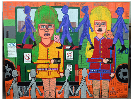 강원진, 〈여성시대(女盛時代)Ⅱ-버스정류장〉 캔버스에 아크릴, 혼합재료, 91×116.8cm, 2025