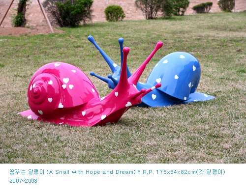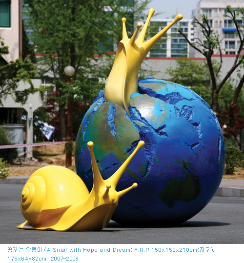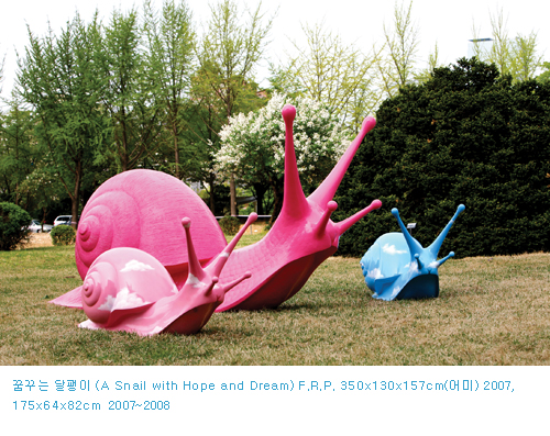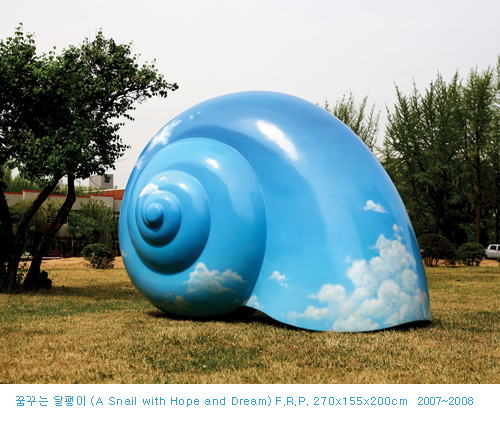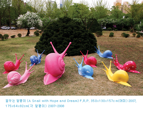 어린 아이에서부터 어른에 이르기까지 폭넓은 관람객에게 다가가며 생명체의 아름다움과 그 안의 다양한 기억을 이끌어내는 기호로서 제시되는 작가의 확대된 '달팽이'들은 내셔널 지오그래피와 같은 다큐멘터리 화면에 소개된 미지의 생명체처럼 신비감을 제공한다.