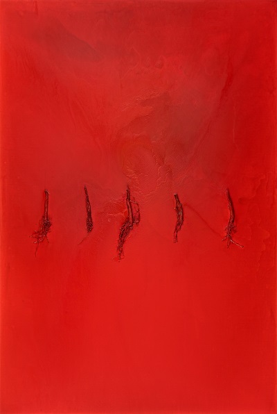 드러내기/감추기의 물감 운용이 만드는 효과는 닥나무 뿌리가 콜라주 기법으로 부착된 부조적 지대에서 도드라지게 나타난다. 닥나무 뿌리가 외형적으로 강렬한 ‘형태적 이미지’를 품고 있지만 자신의 몸 안으로 물감을 흠뻑 뒤덮은 캔버스 표면과는 달리 닥나무 뿌리는 굴곡진 몸체 위에서 흡수의 정도를 달리한 까닭에 주변에 물감을 엷게 올린 채 ‘물질적 이미지’를 강하게 드러낸다. 희미한 영역에서 아스라하게 퍼지는 ‘빛과 색’의 기운이 자리하는 것처럼 말이다. 이러한 차원에서 닥나무 뿌리 주변의 이미지는 오히려 형(形)이기보다는 광(光)으로 드러나는 셈이다.