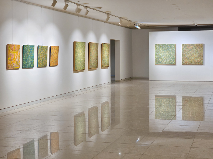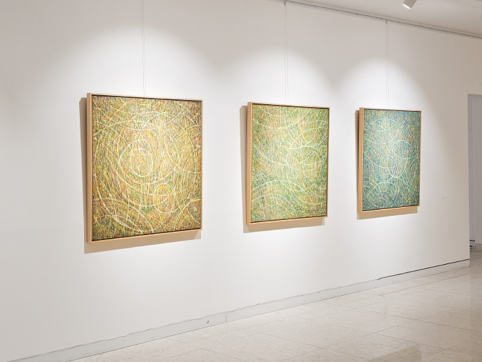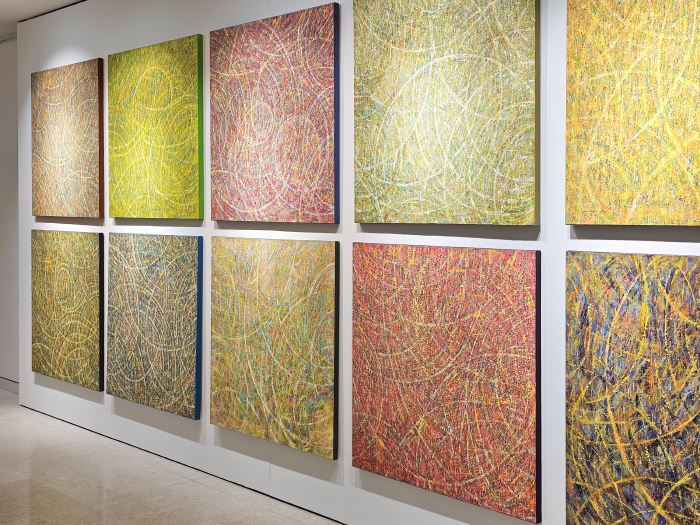 각각의 수많은 색채가 다툼을 넘어 총체적이고 우주적인 조화에 도달하는 것, 그것이 화엄의 정신이다. 하나와 전체가 서로 얽혀 들어가 있는 관계, 티끌 속에 세계 전체가 반영되어 있고 찰나 속에 영원이 포함되는 화엄의 구조를 시각적으로 보여주듯 색점과 색선은 끝없이 되풀이되며 이어진다. 하나를 위한 모두, 모두를 위한 하나(一卽多 多卽一). 하나의 필획은 전체 속에서 존재감을 드러내며 수많은 필획은 하나의 필획을 통해 성립된다.