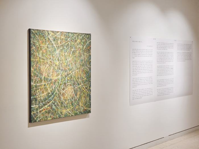 그러나 이후 색선과 색점의 엉킴 속에서 이어지는 은근한 질서, 무위(無爲)를 지향하는 유위(有爲)의 반복, 불협화음을 감싸 안는 화음의 질감, 혼돈을 극복하고 자리 잡으며 확산되는 여운과 파장 등이 자아내는 ―미완성을 위한 완성, 완성을 위한 미완성, 부조화 속의 조화, 조화 속의 부조화 라는― 모순된 진리(paradox)의 아우라(aura)를 통해 작가는 ‘잘 장엄된 깨달음의 꽃밭’, 즉 ‘화엄’의 세계를 펼쳐놓으려 한다.