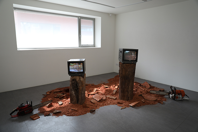 배병희, <FUNCTIONAL_BODY / ERROR_SUPRESSED>, 2026, 가변설치, 아날로그 모니터, 2채널 비디오, 참죽나무, 체인톱
