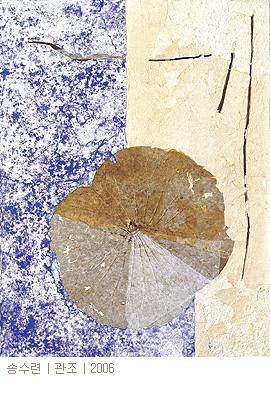 송수련은 이러한 한국인 특유의 정신을 바탕으로 하고 있으며, 작품에서 보이는 절제된 형식 역시 그러한 격을 드러내려는 고차원적 의도에서 비롯된 것이라고 해석된다. 그렇다면 그 절제된 형식 이면에 들어있는 풍요로움은 무엇일까? 이번 전시회에서 그녀는 작품에 연잎을 등장시켰다. 커다란 연잎을 잘 말려 화면에 접착하고, 그 위에 한지를 붙여 고정시켰다. ‘붙여 고정시켰다’는 표현보다는 ‘붙여졌다’라는 표현이 더 적합할지도 모를 정도로 그 밀착이 자연스럽다. 마치 오랜 시간의 풍화를 거친 화강암처럼 마른 연잎의 섬유질과 한지의 섬유질이 자연스럽게 얽혀져 있다. 사실 종이도 그 고향이 나무인지라 이들의 만남은 명절날 시골의 고향을 찾는 사람처럼 반가운 만남이다. 오랜만에 고향의 산천을 보게 되면 각박한 현실로 상처 난 마음이 위로되고 동심으로 돌아가듯이, 종이와 연잎의 만남은 어떤 목적으로 일시적으로 헤어져 서로 다른 것처럼 인식되어 왔던 것이 본래는 하나였다는 새삼스러운 사실을 환기시킨다.