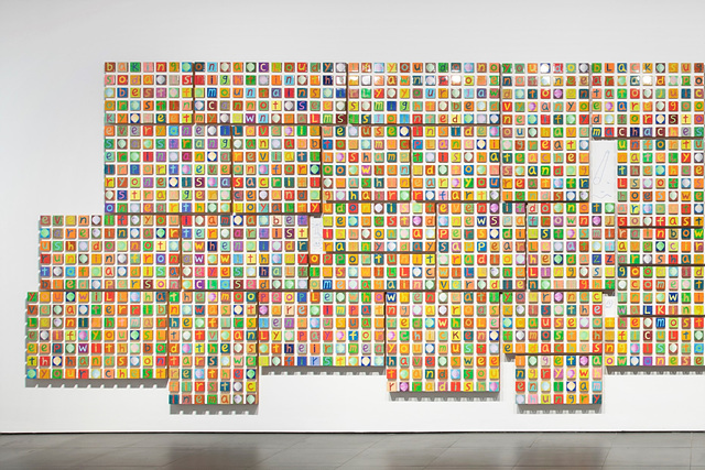 12년 만에 열린 강익중의 국내 개인전 [달이 뜬다]는 픽셀 같은 형식의 작업 외에 달항아리를 소재로 한 작품들이 대거 선보여서 두 도상의 관계에 대한 궁금증을 자아낸다. 그의 작품은 작은 정사각형 안에 제각각 자리잡은 소우주같은 모습으로, 소우주가 모여 대우주가 되고, 손안의 작품들이 모여 공공적 차원으로 확대되는 등의 양상을 보였다. 사각형은 도시적이다. 대도시에서 한 평 땅의 가치는 얼마나 큰가. 문자, 기호, 그림 등이 담긴, 작은 사각형들이 가득 모여 있는 작품은 작은 가게들이나 아파트 등이 촘촘히 서 있는 도시를 연상시킨다. 하나의 사각형 안에 들어있는 문자가 단어와 문장을 이루는 작품은 문자성(literacy)과 인쇄문화의 관계 또한 말한다. 미디어 이론가 마샬 맥루한은 [구텐베르크의 은하계]에서 문자성은 구술성의 문화를 마감하고 근대를 열었다고 평가한다. 문자가 활자처럼 한 칸에 하나씩 자리한 인쇄와 결합했을 때 폭발적인 정보혁명을 가능하게 했다. 큐브 구조는 풍경이 되기도 한다.