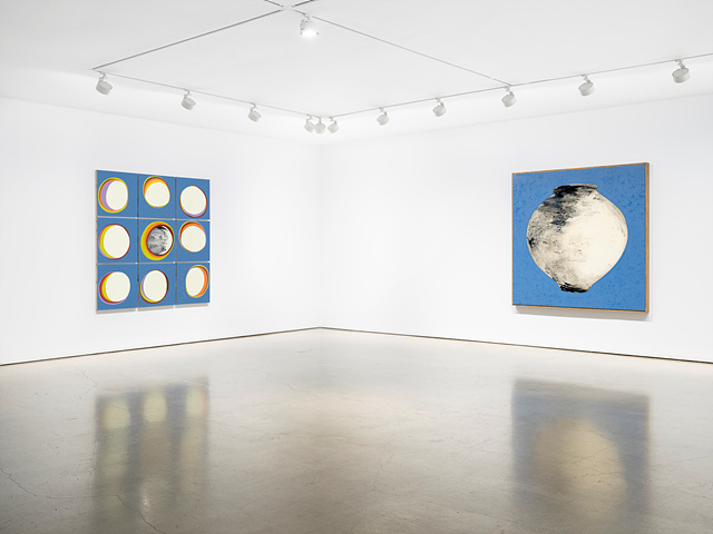 [달이 뜬다] 전은 단순히 어떤 자연 현상에 대한 묘사라기보다는, 달로 대변되는 패러다임의 전환을 말한다. 예술은 자연에 가까워지기 위한 유력한 어법이긴 하지만, 자연은 아니다. 작가가 선택한 달항아리는 달을 품은 듯한 인공물이다. 강익중은 달항아리를 직접 빚지도 않았고 그것을 회화적으로 표현한다. 화면은 도자기 표면처럼 반들거린다. 그에게 만물을 담을 수 있는 것(器)은 여전히 그림이다. 달이 여려 단계를 거쳐 평면 속에 들어와서 문자들과 어울린다. 알파벳 문자들이 있는 작품 속에 달항아리 또한 자리한다. 글자 하나하나가 단어나 문장으로 생성되는 가운데 달항아리 이미지는 띄어쓰기 칸에 자리한다. 그것은 쉬어가거나 국면을 전환하는 마침표가 된다. 입자로 이루어진 원자적 우주에서, 공백처럼 보이지 않는 가운데 중요한 역할을 맡는다. 띄어쓰기가 안되면 문장으로 읽기 힘들다. 반면 현대사회를 이루는 단위 구조들은 도미노처럼 빽빽하게 배열되면서 위험을 키우고 있을 뿐, 의미의 소통을 위해 진짜 필요한 공백이 부족하다.