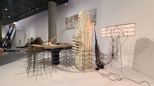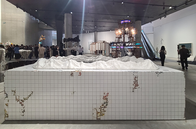 이번 전시는 조각, 대형 설치, 평면, 드로잉 등 다양한 장르를 아우르며, 이불 작가가 지속적으로 탐구해 온 인간과 기술, 시대와 문명에 대한 깊이 있는 사유를 입체적으로 경험할 수 있도록 구성됐다. 특히, 20세기 초 비행선을 연상시키는 은빛 설치 작품 〈취약할 의향–메탈라이즈드 벌룬〉이 전시장 입구에 설치되어 관람객을 맞이한다.